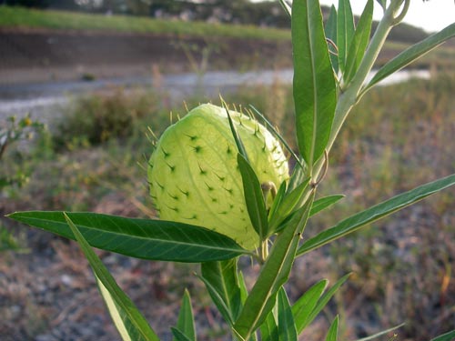 南アフリカ原産の常緑低木。高さ2〜3mになる。葉は線状披針形で対生する。8月から9月ごろ葉腋に散形花序をだし、花径1.5cmほど白色の花を咲かせる。花冠は2重になっていて外側の花冠は反り返る。晩秋に球状で表面に柔らかい毛の生えた5〜6cmの実がなり、はじけると白い綿毛のある種子が出る。