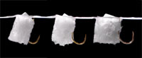 4月10日、最終報告をしておいて、まだしつこく改良?しています(笑)[やけくそパターン(2003/04/06)]はフックが水平になっているので鯉にはどの方向からもしっかり見えてしまう為か見切りが少しあった。せめて正面からはフックが見えない姿勢([Chubby]と同じように垂直)にならないか?と言うことで考えたのが[やけくそパターン-V]。フローターがV字なのと垂直に浮くのでの[Vertical(垂直)]の[V]をくっつけた(笑)
