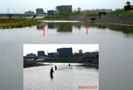 4月17日、浅川のお花見ポイントに行ったのですが川原に着いて驚いた!先週まで見えていたテトラや岸の浅瀬が全て見えなくなっている。流れに入ってみると今までよりもずいぶん深い。対岸までの距離と立ち込んだ位置とで様子を見ると20cmも水位が上がっている。[何故?]と下流を見ると用水用に作られた土手が改修されていて流れ出しが今までよりも高くなっていた。膝上くらいで流れの中央付近まで簡単に行けたのが1/3位までしか行けない。狙ったポイントに立ち込むためには股上になってしまいそこまで辿り着くことが出来ない。遠目からキャストしてみたら流芯の流れがきつくて流芯の向こう側にキャストするとドラッグが掛かってしまう。対岸に渡って斜め護岸からキャストすることも考えたが、目の前に隠れているテトラでラインブレイクするのは確実。仕方なく上流部からの釣りで様子を見て下流部はパス。対岸からのキャストは水位が上がった分ラインブレイクは少なくなるかも判らないので次回にチャレンジしてみることにしたが突然の水位の変化には驚いた。これから田植えの季節になるので仕方ないのですが。 |