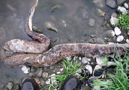 二子玉川にニシキヘビ(2.2m)!!(2008/3/29) 3月29日、二子玉川にニシキヘビ(全長2.2m)が居た!と言っても生きてはいませんでしたが。いないなさんが見つけて教えてくれました。ポイントF-2で釣りをしていたいないなさんが戻ってきて「これは何でしょうか。ヘビですよね?」と言いながらデジカメの画像を見せてくれた。画像には白っぽくて長いものが写っていたがよく判らないので「どこですか?」と聞き二人で見に行った。その場所はマルタを釣っていたF-4への流れ込みの少し上流の左岸。水際に腹を上にし て転がっていた。先週の雨で少し増水しているから、その時流れ着いたのではないだろうか。その死骸、皮はしっかりしているが中味は殆ど崩れかかっているようで、足で押してみるとブヨブヨだった。頭と思われる部分は形をとどめず崩れていたが僅かに骨らしいものが残っていた。小さく白いものを拾い上げて眺めるとそれは歯のようだ。腹を上にしていたので裏返してみると皮に残っている模様はどう見ても日本のヘビではない!しかも太くて胴体の直径は10cm以上もある。一方を摘んで伸ばしてみると全長は2.2mも在った。ヘビに関してそれほど知識があるわけではないが表面に残っている模様からニシキヘビの仲間ではないだろうか。大きくなりすぎて多摩川に捨てられ、冬の寒さに耐えきれず死んだのだろうか?それとも、死んでから捨てられたのだろうか。飼っているときに死んだのなら別に川に捨てなくてもゴミとして処理することもできたと思うから、生きているうちに捨てられたのではないだろうか。そう考えると「死ぬまでは何処かで生きていた」となるのだが・・・。こんなのに出会わなくて良かった。