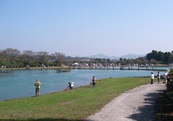 10月18日、前日の様子見でフライを絞りきれないまま当日の朝になってしまった。前夜パラついていた雨も上がり快晴で風もない絶好の釣り日和。駐車場で仮眠していると「少し早けれど、今日は大会があるので開けますよ」と係の人に起こされた。さっそく入漁券を購入して3号池横に行く。スペシャルポンドの対岸にはいくつもテントが設営されていている。車の中で朝食をとり時間を待つ間、目の前の池からは湯気が立っていた。7時を回った頃から対岸に設置されているTIEMCOのテントに向かう 人が多くなり「受け付けを開始します」のアナウンスが流れる。デジカメだけ持って3号池横の通路を通り対岸に行く。通路では前日にあった[釣り禁止]の立て札がとり外され、代わりにエリアナンバーの書かれたプレートが置いてある。通路を渡りきったとき、朝日が昇っているのに気付いた。テントに着きエントリーを確認してエントリーカードと参加賞を受け取る。TIEMCOのテントの横では、あの里見さんが「お弁当はいかがですか?」と声を掛けていた。それから車に戻りタックルの準備。前日、どのフライをメインに攻めるか決めることができず、とりあえず最初に釣れた[ゆっくり沈むフライ]とインディケーターのセットをメインにする。予備は[ラバーレッグ]を結んだセットと[コカゲロウ] のセット。この日のために買い込んだラバーネットと一緒に再びテント前へ。「参加者は集合してください」のアナウンスと共に大会開始の挨拶があり、参加者は総勢65人とのこと。人数の関係で1回戦は従来と同じ1対1の対戦だが2回戦は3人の対戦で1番が勝ち残りとなると説明があった。説明の後、場所決めの抽選カードを引く。引いたカードは[B-17]。カード2枚に名前を書き1枚を提出し残りの1枚をネームカードにして首からぶら下げる。前日から様子を見ていた岡本プロがいらっしゃったので「釣り場はどこになるのでしょうか?両岸は厳しいから通路がいいな〜」と話すと「番号はいくつ?」「B-17」と答える。「17だったら通路です。両側は最悪だから良かったね」とのことで一安心。暫くして対戦相手 の発表。と言うか番号順に並ぶ。各組の取り合う番号が対戦することになり私の相手はB-18番。それは小学生と思われる山本龍治君。2組に分かれてそれぞれ釣り場に移動。私たちの釣り場は通路のほぼ中央。1回戦はA組の前半戦20分の後B組の前半戦20分が行われ、再びA組の後半20分の後B組の20分があり、合計40分での合計釣果を競う。本部からのアナウンスでカウントダウンが始まり大会スタート。私たちの組のA-17番さんが快調なスタートで、全体での1番釣果を上げ、その後も入れ食い。釣り方はインディケーターを付けて沈めるタイプでフライはオレンジっぽい物。それを見て私も最初に使うフライをオリーブからオレンジに替える。あっという間に20分が経ち、私たちの番になる。さっそくキャストを開始するがなかなか釣れない。 10分が経過する頃にやっと1尾目がヒット。無事ネットインして一安心。しかし対戦相手が1尾釣り上げると気が抜けなくなるので場所をあちこち変えながらキャストを繰り返すが、前半はこの1尾だけ。後半戦は場所を入れ替わっての20分がスタート。A-17番は2尾追加して合計9尾。この渋い状態の中で最高のスタートだ。後半では2尾目が釣れたらドライで様子を見ようと思っていたが後が続かず1尾のまま終了。運良く対戦相手が釣果無しだったので勝ち抜けることができた。2回戦は勝ち組と負け組が3人ずつの組み合わせになり10分ごとに釣り場を入れ替わり合計30分での勝負。釣り場は通路の一番端で私はその左端。ちょうど目の前にライズが少し見えたのでドライから始める。数カ所 キャストしてすぐに1尾目を釣り上げる事ができた。これは良かった。気分的に楽になった。10分経って場所を入れ替わり3人の一番右に入る。そのままドライで様子を見たが反応がないのでインディケーターに変える。その直後、隣が1尾釣り上げて並ばれる。そのすぐ後に私が2尾目。そして場所を入れ替わり最後の10分。3人とも追加することができずにタイムオーバー。2対1対0で2回戦を勝ち抜けることができた。次は午後からの準決勝。2回戦を勝ち残った勝ち組と負け組の各十数人が一斉にスタートする30分一本勝負。釣り場はナンバーカードを引いて番号順に優先的に選ぶことができる。私の番号は2番で「この中から好きな物を順番に持って行ってください」と準決勝の賞品(?)がもらえた。場所選びも2番目で良かった のだが「どんな釣り方がいいのか」と言う事ばかり気にしていて、どの場所がどうなのかチェックする余裕が全くなかったから、何処がいいのか分からない。選べるエリアはクラブハウスの反対側でとりあえず後ろの広そうな場所を選ぶことにする。場所を決めてから他の人達の場所選びを見ていると皆さん流れ込み付近に集中している。「あっ!」と気が付いた。「そうだ!少しでも水の動いているところがい