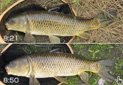 7月2日、先週に引き続き、ウィンブルドンの女子決勝を最後まで見てたまっていた録画分を眺めていると、窓の外がうすら明るくなってきた。「それじゃ、今週も行くか…」と言う事で4時半過ぎの早朝出漁。ポイントは先週と同じ[二ヶ領上河原堰堤]上の[D]エリア。家を出る時は木にならなかった風がポイントに近付くと気になり始める。京王線の鉄橋をくぐり、前回のポイントに着いてみると対岸からの風で水面が波立っている。タックルを準備しながら前回のポイントを眺 めるが、コイの姿が全く見えない。岸辺のブロックの上は勿論、橋桁が写り込んで見やすい水中にも全く回遊している姿が見えない。「エッ?どこにいるの?」と言う事で周辺を探すと、橋桁の陰に下流から浮きながら移動して来るコイがやっと見つかった。「いた〜」と喜んですぐにキャスト。コイは迷うことなくフライに突進してきてヒット。しかし合わせの直後の一走りであっさりブレイク。準備をしていてティペットに微かなざらつきがあるのは分かっていたが[たいしたことはない]と交換を見送ったのがいけなかった。このブレイクで回遊は消えてしまい全く反応がない。上流の護岸帯に行けば必ず居るはずなのだが、貴重な早朝の時間を、移動に費やしたくないので、直ぐ下流の様子を見る事にする。ゆっくりコンクリー ト護岸の上を歩きながら岸辺の様子を見ていると、下流からの回遊がポツポツ見られ始めた。移動の筋の合わせて上流にフライを落として回遊を待つ。しかし見切られてしまう。幾度か見切られながら、開始から25分で一尾目をゲット。途切れ気味だが回遊は適度に在り、何とか3尾釣り上げることができた。しかしポイント下流は浅場くなっていてコイの姿が見えなくなる。その時点で右岸を諦め中州に渡り先週良かった左の流れの様子を見に行く。しかし、先週の後半と同じように水面は一面に波立ちコイの反応は見えないし、フライもラインも見えない。粘っても期待できそうにないので中州の左側を諦め、右側の流れの様子を見る。しかし、こちらは流れがかなり遅い。やっと見つけた反応に向かってフライを送り込んで行く のだが、1m流れるのに7〜8秒近く掛かるので、なかなかフライが下流に行かない。それでも反応のあった所まで行くとかなりの確率でヒットするから少しは我慢できる。40分ゆっくり下って4尾釣り上げたところで反応が消えてしまう。浅そうな流れなので右岸にそのまま戻ることもできそうだったが中州の先端まで行ってみることにする。中州の中は草が生い茂っていて歩けそうにないので岸際を歩いて下る。先端近くまで来ると少し水深の深そうなところがあったので、様子を見ると少し間隔を開けながらも回遊が見られた。しかしここのコイ達は見切りが激しく、フライの直前で水しぶきを上げて消える。幾度も水しぶきを上げられ後、やっと1尾を釣り上げる事ができた。しかしこの1尾で回遊はストップしてしまう。中州の 先端まで行くと、左岸からの風が目の前を通り抜け、一面に波立っていて下流側は反応がない。波の無い中州の風下側に向かってやっと1尾目をヒットしたが、このコイは背鰭の割れた感じといい口の横の傷といい、微かに見覚えがある。[いつ見たのかな?]とデジカメで釣り上げたコイの画像をプレビューしながら、足元のコイと比較すると、直前に釣り上げたのと同じコイではないか。始めは8時21分で、次は8時50分で30分の間に2回も釣れている。いくらポイントが少ししか離れていないと言っても、こんなに広いポイントで連続で釣れるなんて。中州の先端ではこの1尾だけの反応で、先端を諦め上流に戻る途中、見切りの激しいコイに出会ったポイントの様子を見る。回遊は頻繁ではないが、飽きない程度にやっ てくるので、フライを[Shock-Pnn]に変えて挑戦し直ぐにヒット。次は15分後にヒット。その20分後にもヒットして見切りもなくいいペースだったが、3尾釣り上げたところで回遊は消えてしまう。時間は10時を過ぎていたので、ここを切り上げて京王線のところに戻る。鉄橋の上流側の巻き返しで反応が出るかと期待していたが、全く反応ナシ。京王線周辺を切り上げて、斜め護岸の上流部に移動することにする。鉄橋から400m程上流へ行き右岸沿いに流れの様子を見ながらゆっくり釣り下る。上流側の流れが少し速い場所では、ほとんど反応が無かったが、中流部からは岸沿いに反応がポツポツ現れ始める。1尾目はすぐに釣り上げる事ができたが、なかなか後が続かない。反応自体は活発で元気に飛び出して来るが横移動が激しく、 岸際で出たと思ったらすぐに沖に向かって移動してし消えてしまう。下流に見える反応に向かってフライを送り込んでいくと、フライが反応のところに届いているのに反応しない。[おかしいな〜]と思いながらそのまま流し続けが、次も反応しない。[ひょっとして]と急いでフライを回収してみると、フックに浮き草が絡んでいる。「これじ