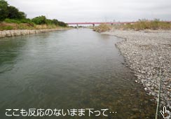 10月2日、前日の貧果にガックリしながら二子に行きました。しかし今の二子で唯一期待できるのはいつもの兵庫橋上だけ。しかもそれほど数がまとまる可能性もなく「前日より多くなればいいかな」という感じで出掛けた。ポイントに着いてみると餌釣り等の先行者は無しで、お気に入りの[虎の門]周辺での釣果が期待できた。最初のポイントは前回障害物を取り除いて奥が狙いやすくなった[虎の門]前。上流からの風が吹いているので、少し上流側から門の前を探る。居た居た、 一番奥の薄暗いところで反応が出た。しかし目の前の倒竹が邪魔で奥にフライを落とせないので、立ち位置を少し下流に変更して奥を狙う。フライはうまく奥に落とす事ができるが、手前のラインが流れに載ってしまい僅かな時間でフライが動き出してしまう。ラインが水面に落ちる前に上流側にメンディングしてドラッグの掛かるタイミングを遅らせてみるが、反応そのものが出ない。しばらく様子を見ていると直ぐ下流の倒竹の先端で波紋が広がる。倒竹に引っ掛かったサーチに反応しているようだ。[あそこに居るなら次はここに来る]とコースを読んでフライを落とす。フライは倒竹の前をゆっくり下流に流れる。[ボチボチ来るかな?]と期待していると水面から頭が現れフライに向かって大きな口が開く。開始から15分で 快調なスタート。[虎の門]の奥で反応はポツポツ出るが、フライをドラッグフリーで流すことが難しい。反応がどこに出るか探していると、今度は上流側の倒竹の葉の奥で波紋が広がる。下流側は手前の倒竹が邪魔でキャストできない。倒竹の切れ目から狙えるのは、波紋の出た所のすぐ上流の倒竹の切れ目で、上流側の倒竹の間で対岸が見える所。しかし窪みの上には倒竹が2本横たわり、フライを上から落とす事ができないので、低い位置からダイレクトに振り込むしかない。ループ幅を狭くするため早めにロッドを止めて、後のラインがが伸びきるまで待ってから振り込むと、フライは狙った窪みの奥に着水。[お〜、いいところだ]と嬉しくなるような会心のキャスト。[これでヒットしたら…]などと考えていると、 倒竹の下からフライに向かって黒い影が動く。[来た]と思った時、影はフライの下を通過してしまう。[ダメか]と思った瞬間、影は反転してフライに向かい、水面に頭を出して一気に吸い込んでくれた。1尾目から僅か13分後の連続ヒット。[期待していたよりもいいスタートだな〜]と感心しながら次を狙う。[虎の門]での反応が途切れたので、その下流の倒竹の裏を狙おうかと思っていた時、後で水の音がした。振り返ると中学生位の若者がスピニングリールに先に白い物をぶら下げて下流の倒竹前に進んで来る。[ルアーか]と思っていたら、その白い物は飛ばし浮きでその先にパンを付けて倒竹の裏に向かってキャストを始めたが、しばらくして倒竹に針を引っ掛けてそれを外しに行く。[あっ〜、やった]とガックリ。そ の後彼はそこから下流に流して喰い気十分に水面に浮いていたコイをヒットしてしまう。1尾釣り上げると、移動する事は期待出来ないので、兵庫橋上を切り上げて本流の様子を見に行く。二子橋の上流で流れの様子を見ると、ここも前日と同じで少し濁りがあり流れが速い。兵庫島横の護岸帯の下流には大きな巻き返しがあり、濁りの中から時折黒い影が水面に現れるので、その前方にフライを落とすが全く無視して通り過ぎてしまう。そこを諦め二子橋の下流へ移動。本流に出る前に左岸沿いの細流の様子を見ると、元気な反応が50m程先に現れた。コイを脅さない距離までまで移動してフライを送り込んでみたが、反応が出ない。そのまま50ヤード流してみたが反応ナシ。数回流した後諦めて本流へ移動。本流は前回よりは 水位が下がり、砂利の中州がかなり下流まで伸びている。伸びた中州の左側にあったワンドは細くなって浅い。しかも先端部の期待していたポイントも水深が10〜20cmほどしか無く回遊は見られない。こうなったら行くところがない。流れを渡って対岸のいないなプールへ行きたかったが、濁りのために水深が読めない。仕方なく下流部の探索に行く。下流はこのポイントから左右に分かれ、右は岸沿いにストレートな流れ。平水なら中州側の緩い流れに幾つか回遊があるがそれが出ない。しかも下流の遠くにアユ師の姿が見えたので中州を横切って左の流れに移動する。左の流れも護岸沿いにストレートな流れだが、中州側に小さな変化があり回遊が期待できた。しかしそこにも回遊は全く無く、終点の第三京浜の橋に着いてしま う。橋の下をくぐったところで右の流れの様子を見に行くが、こちらも流れが速くコイの居そうなポイントが見あたらない。そのまま右の流れに沿って上流に移動している時、水辺の砂地が崩れかかっているのを見つけた。[増水でえぐられているのか]と覗き込んで気付いたのは、以前は流れから離れた場所だったこと。上流に向かいながら下流を