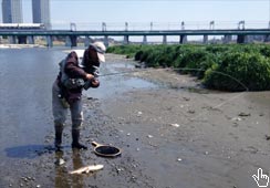 4月1日、前日は強風と雨模様のため出漁をひかえ翌日に期待する。日曜日、そろそろ起きようかと思っていたところに藤澤さんから電話が入り「これから行きます。よろしく」とのこと。[エッ?もう出掛けるの]と少し焦りながら急いで食事をして出掛ける。天気は良く雨の水位の上昇は見られないが気温が低く少し風が強いので、ちょっと心配しながら到着。[藤澤さんはどこにいるのかな?]と探しながら兵庫島の横に来た時電話が入る。「藤田さん今どこですか?」「もう 河原です」「ロッドを忘れちゃいました」「エッ?どこに?」「家です」と言う。居場所を確認して合流すると「昨夜、全部準備して確認したのに。ポイントに着いてさあこれからと言うとき気付いたんです」「どうするの?ちょっと待って、いないなさんに借りられるかどうか聞いてみる」と電話するが出掛けている。木村さんは既に河原にいて「今日は一本しか持って来ていません」とのこと。徳永さんは今日の出漁予定は無くてNG。「やっぱりダメでした」「とりあえずマルタの様子を見ます」と言う事で一緒にポイントに向かおうとした時、対岸の中州にいたフライマンがマルタをヒットした。「バシャバシャやっていないのに良く釣れたな」などと話ながら上流のポイントに向かう。ポイントでは予想通り水しぶきは上がらず、 流れ出しの間にコイの姿が見えるだけ。そのコイの様子を見ようと流れに降り水温を計ると13度しかない。木村さんに電話した時「最初はマルタが釣れたけれど風が吹き始めて反応が消えてしまいました」と言っていたが、その通り下流から強い風が吹き水面が波立っていて全く反応しない。藤澤さんはウェーダーを履いて上流の様子を見ていたが「新二子橋下辺りにコイの姿が見えたていた」と言って、そちらに行き水辺に座り込んでいる。ポイントではコイも反応してくれないので下流の藤澤さんの所に行くと藤澤さんはリールからラインを引き出し、それを流してコイの反応を待っている。「何、それは[置き竿]じゃなくて[置きリール]?」と驚くと「4回も口を開けて出てきたのに」と悔しそう。「合わせないから無 理でしょ」などと話しているところに松田さんが上流から下ってきた。二人が話をしている時、目の前の流れではマルタがしきりにロールしている。産卵行動は見当たらないがマルタの存在はハッキリしているので[沈めて流せば釣れるかも]とマルタ仕掛けに交換して流れに入り込む。多摩川のマルタを釣り始めた頃も、水面に姿を見せるのでその付近を流してみたが、1尾釣れただけなので余り期待していなかった。それでもマルタが居るのは判るからしつこく狙う。開始から10分経ってインディケーターの動きが止まる。[ン?]で合わせてみると手元に重さを感じ、動きが伝わってくる。コイにしては軽くすぐに水面に尾鰭が現れた。その形からマルタと判り、上流にいた藤澤さんの方を見る。「マルタ?」「そう!」と告 げてから真剣に取り込みに入る。なにしろ今年最初のマルタだから逃げられるわけにはいかない。掛かり位置は口なので誘導も楽。暫く引きを楽しんでいるとおとなしくなったので、岸辺に引きずり上げて採寸。50cmとまずまずのサイズ。次を狙って同じ流れにフライを落とし、流す筋を手前から沖まで色々変えて様子をみる。10分後少し沖目を流し終えてピックアップしようとしたら掛かった。多分スレ掛かりだろう。一暴れした後で急に軽くなる。先端にフライが見えないので[切れたか]とラインを手繰ってみると、ティペットの先にアイだけが残っていて[変なところで折れたな。欠陥品だな]と考えながら次を狙う。今度は15分後にヒット。引きの様子から口掛かりではなさそうですぐに外れてしまいフライにはウロコ が一枚付いていた。それから小一時間ロールはあるのでしつこくキャストを続けたが、反応が無いので切り上げる。下流の右岸からの合流点に釣り人の影が無くなっていたのでそちらに行ってみる。流れの具合はマルタの産卵場所に適しているのだが動きが見えない。しかし、暫く眺めていると突然小さな水しぶきが上がった。[いた〜]と喜び[水温が少し上がったのかな?]と計ってみると14.5度と昼より少し上がっている。反応は流れの左端で、立ち位置からだとその左側の緩い流れでラインが流れないので、流れを渡って立ち位置を変える。流れの端に見える黒い影の上流にフライを落とし、流れに載せてラインを流すが、フライがポイントを流れる時間は僅か3秒。ポイントを通過してしまうとピックアップしてまた上流から