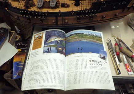 Style FlyFishingのタイトルを見つけてページを開くと、見慣れた多摩川の風景と立ち込んでいるおのまりさんと私。これは10月13日にご一緒したときの模様で、好天気だったのを思い出す。おのさんと園部さんは翌日も登戸に出漁されて、 多摩川を満喫されていました。あれから一月半、やっと本が出版されあの時のことを思い出しながら眺めています。おのまりさんの連載はこれが最終回と言うことなのですが、色々次の企画があるようなので活躍をお祈りしております。また、これからもフライフィッシングに突き進んで行かれることでしょう。記事の内容は[Fly