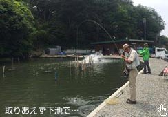 釣り開始前に管理棟横で記念撮影後、取りあえず下池の[アメリカンキャットフィッシュ]から始める。